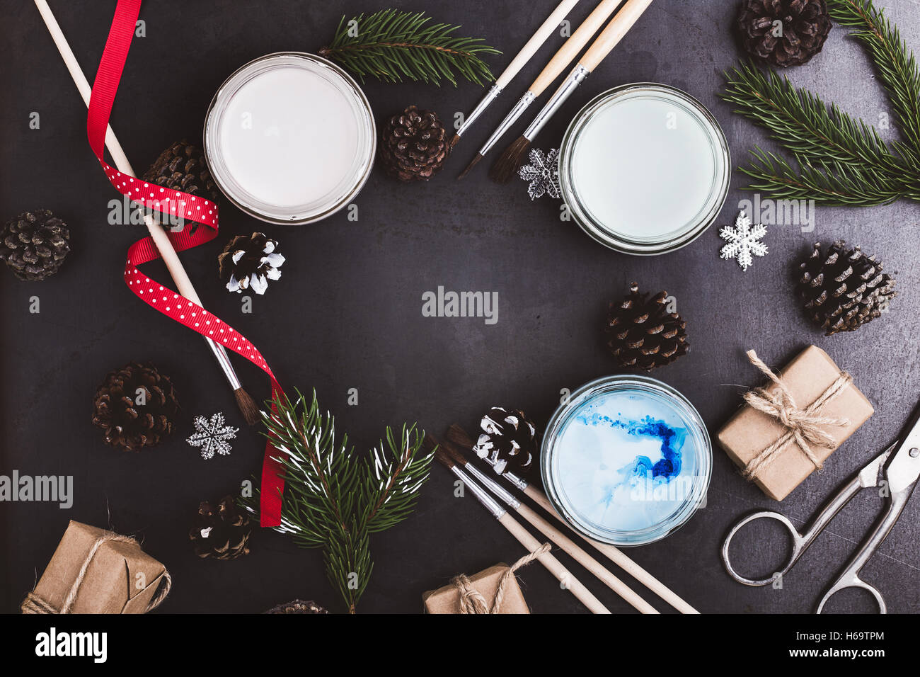Bastidor de pinturas y pinceles en el cuadro azul con espacio para copiar texto de felicitación vistos desde arriba, durante las vacaciones de Navidad tema Fotografía de stock - Alamy